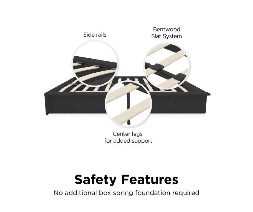 Less is more with the DHP Micah upholstered queen platform bed. This unadorned bed will instantly create a sense of simplicity and calmness in your room. Designed with a slat support system, benefit from increased ventilation allowing air to pass freely underneath you. The slats won’t only keep your mattress fresher for longer but they adjust to the weight exerted on them, providing you with the right amount of support. You deserve to sleep comfortably at night and that’s why the metal side rails, center metal rail and legs take care of that for you, bringing optimal stability and durability so you’ll get to enjoy a truly restful sleep.
