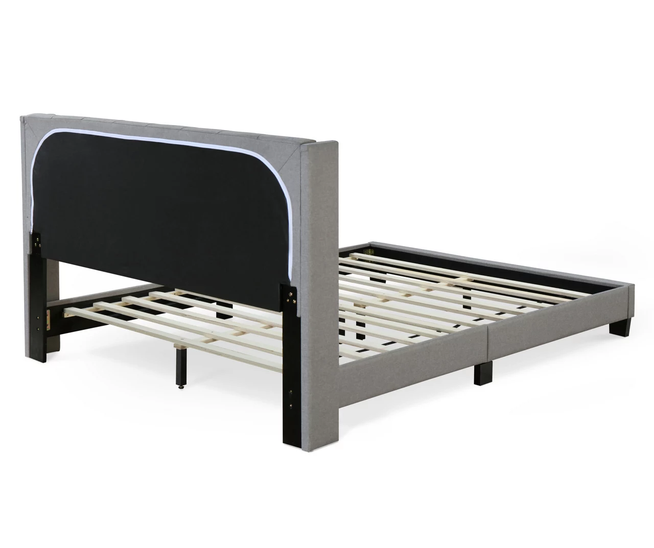 Highlight the contemporary aesthetic of your bedroom with this wingback bed frame. This beautiful bed is upholstered in soft linen-like fabric, available in neutral colors that allow you to easily add colorful room accent pieces to the space. The clean lines are softened by the padded headboard that has a tufting on its face and a shelter wingback design. This bed uses slats to support the mattress rather than a box spring and a slat kit is included.