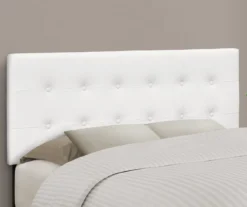 - Button-tufted upholstered headboard in a white leather-look fabric