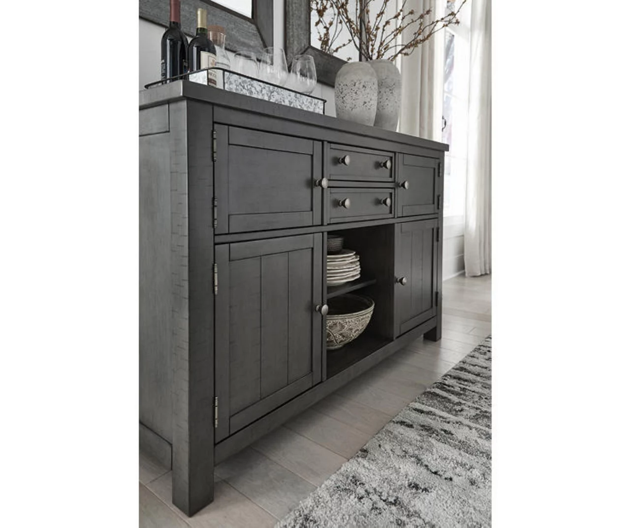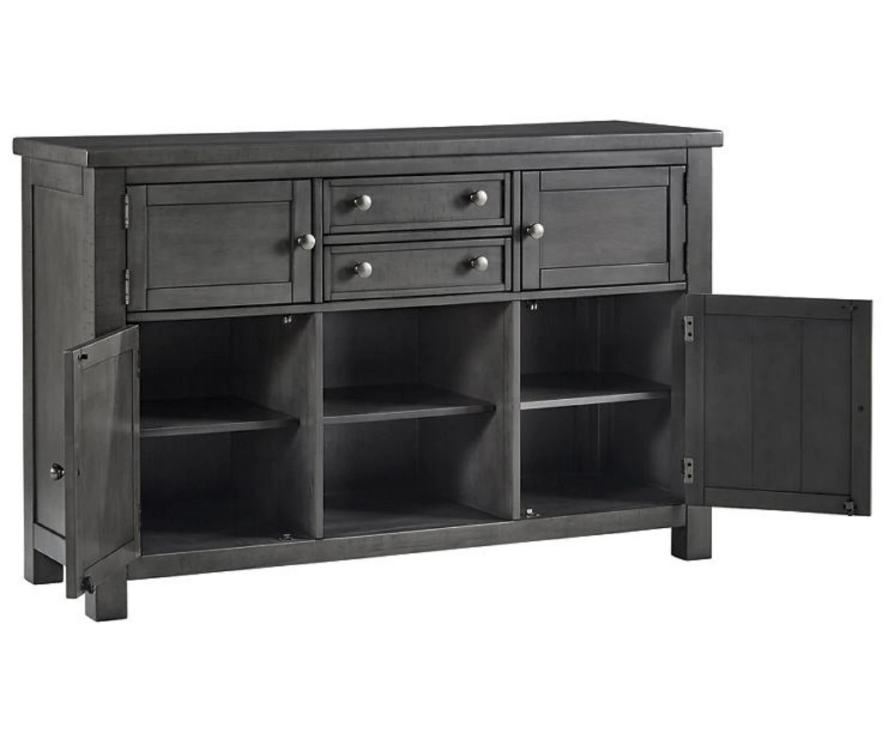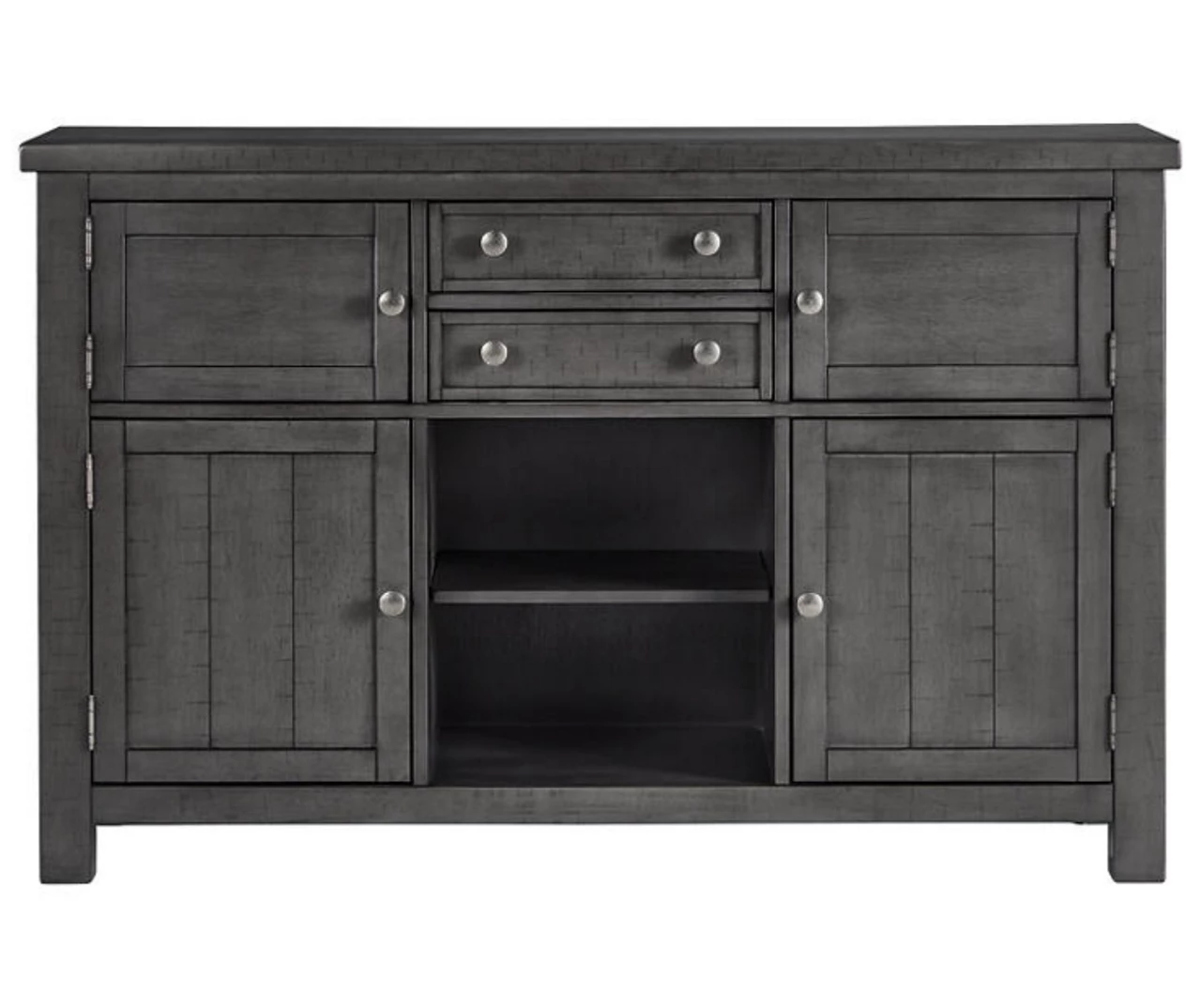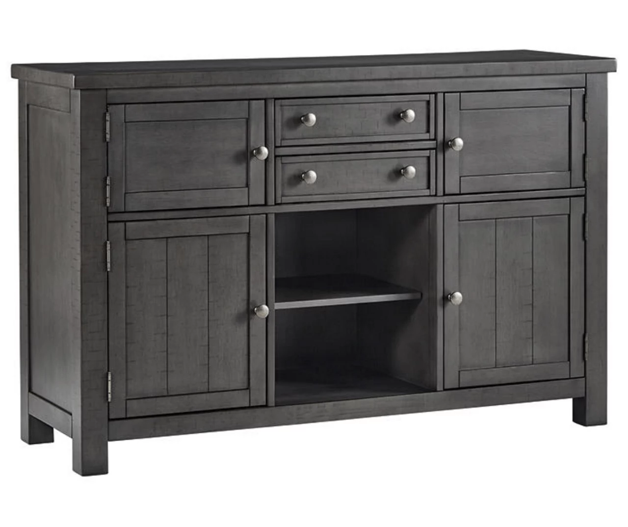 Going gray in the best possible way. This dining room server wows with an utterly on-trend smoky gray finish and plank styling. Crafted of acacia veneer and equipped with an abundance of serving and storage space, this server brings practicality and easy entertaining to your dining room. Just a touch of distressing helps it fit right in with your modern farmhouse décor.