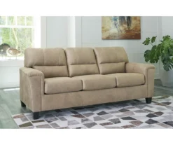 - Faux leather upholstery in a sand color with a pebble texture and jumbo stitching