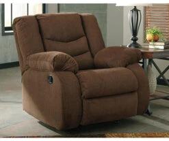 The Tulen rocker recliner puts the win in winning. Its waterfall back design and doubly plump pillow top arms team up with soft chenille fabric to go for the goal. Ample seating room makes the comfort possibilities endless. Sit back and relax. You won’t go wrong with this recliner.